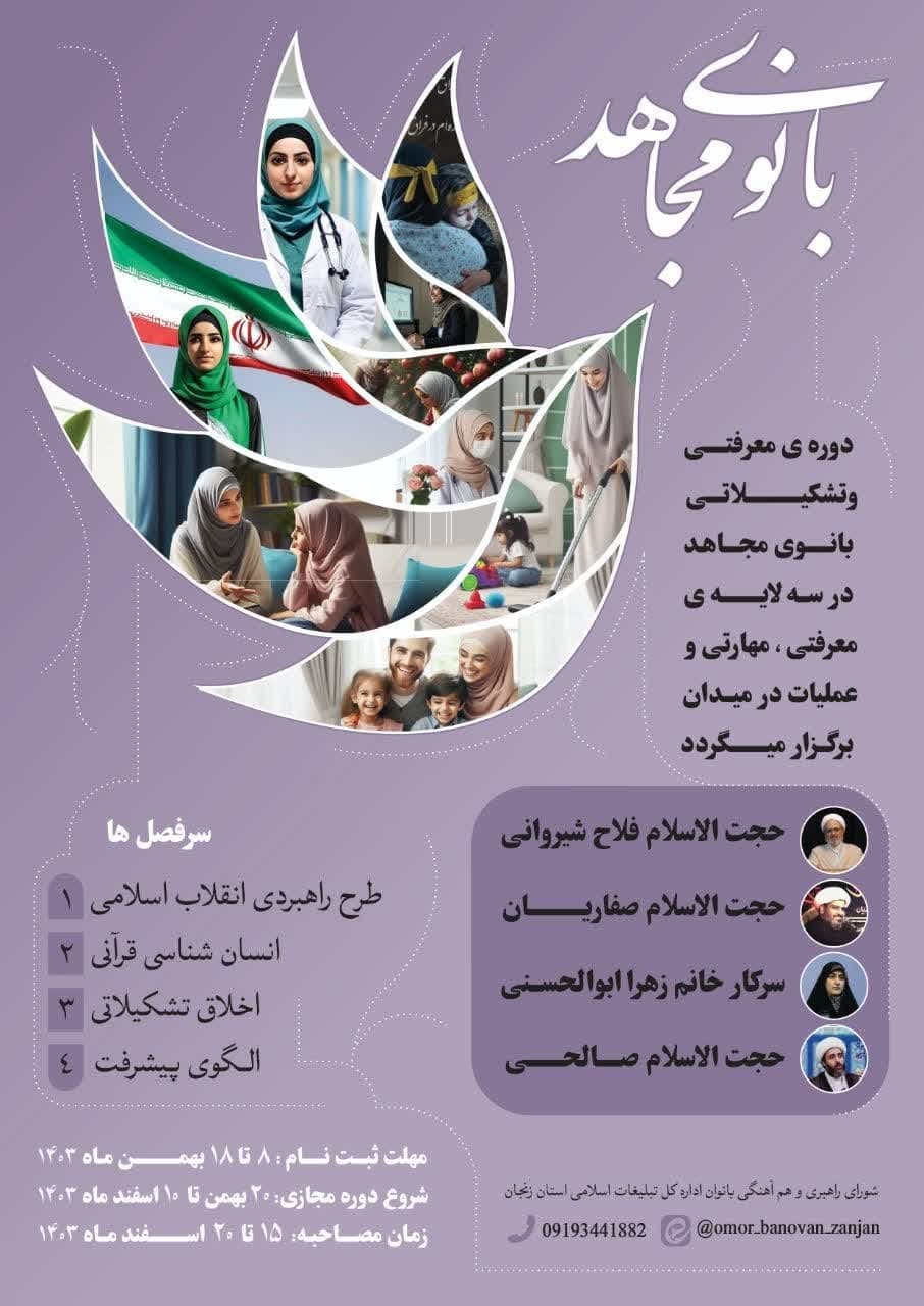 مسئول امور بانوان ادارهکل تبلیغات اسلامی استان زنجان، از برگزاری دوره «بانوی مجاهد» از ۲۰ بهمنماه امسال در زنجان خبر داد.