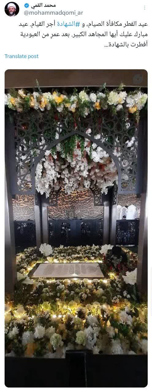 حجتالاسلام قمی همچنین برای مخاطبان عرب زبان در شبکه اجتماعی ایکس این متن را به عربی منتشر کرد.