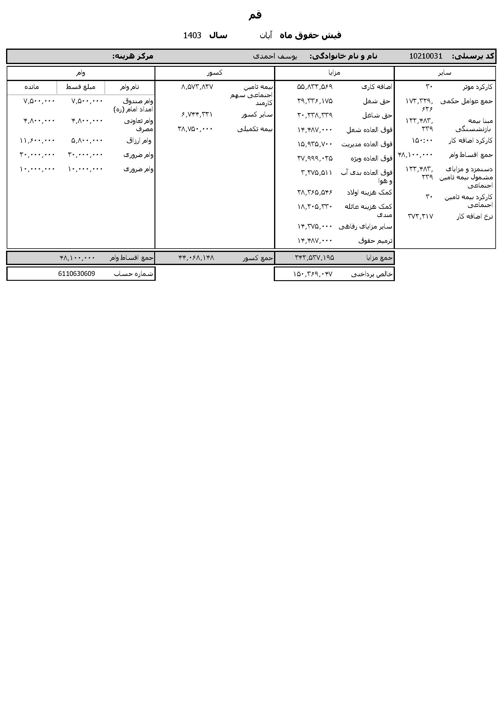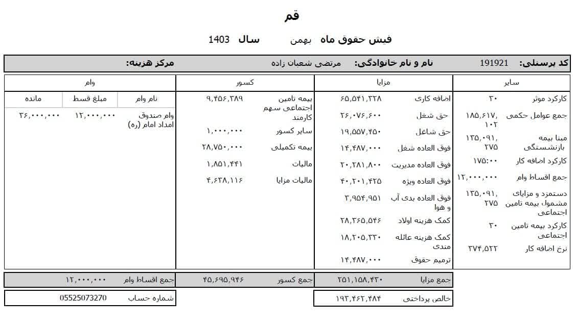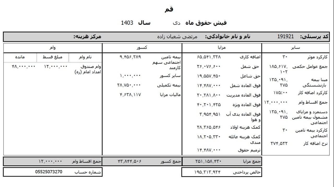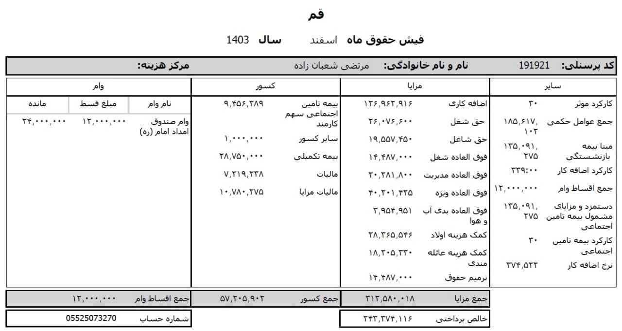 به گزارش روابط عمومی سازمان تبلیغات اسلامی، حقوق عمومی اطلاعات حقوق و مزایای 12 ماهه حجت الاسلام والمسلمین مرتضی شعبانزاده مدیر کل تبلیغات اسلامی استان قم و فیش حقوقی 12 ماهه حجت الاسلام والمسلمین یوسف احمدی معاون اداری و مالی منتشر شد.