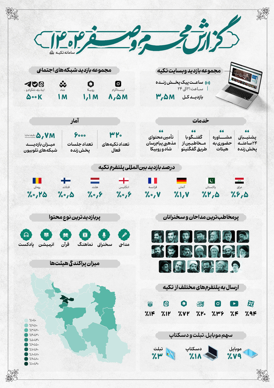 در این بازه زمانی، وبسایت «تکیه» به ثبت ۳.۵ میلیون بازدید کل دست یافت و میزبان بیش از ۶۰۰۰ جلسه پخش زنده مذهبی بود. این سامانه با ۳۲۰ تکیه فعال، به کانونی برای دسترسی آسان و یکپارچه به مراسم و محتوای دینی بدل شده است.