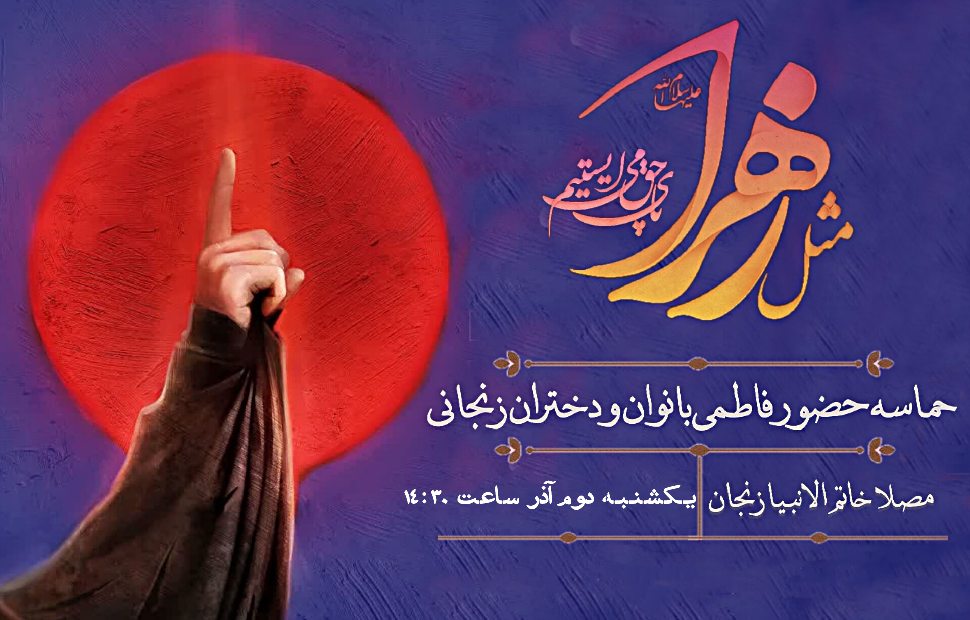 کریمی، مسئول امور بانوان تبلیغات اسلامی استان زنجان، از برگزاری اجتماع بزرگ بانوان با عنوان «مثل زهرا(س)» روز یکشنبه در مصلی زنجان خبر داد و گفت: این مراسم به مناسبت شهادت حضرت فاطمه زهرا(س) از ساعت ۱۴/۳۰ برگزار خواهد شد.